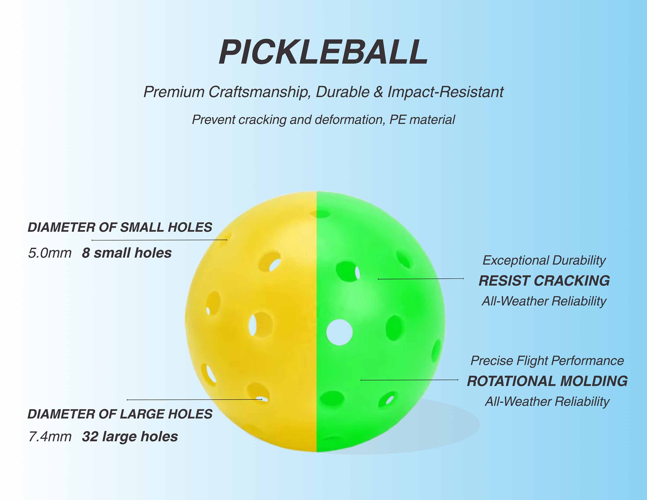 · High-Quality Material: Pickleballs are made of high-quality PE material, which has excellent impact resistance and can effectively prevent the ball from cracking or deforming during intense collisions.