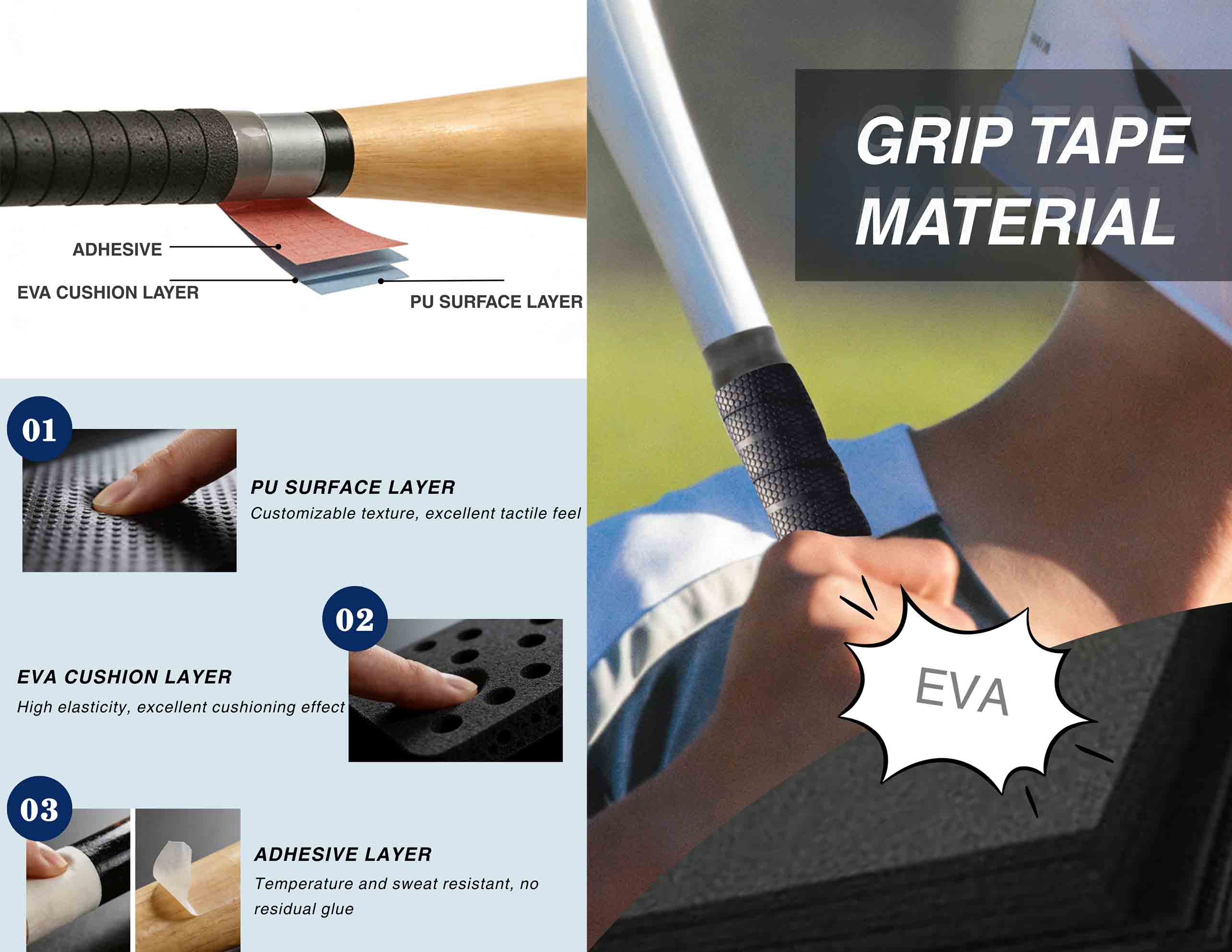EVA material boasts excellent elasticity and resilience, with a low compression deformation rate, efficiently absorbing the impact generated during hitting. In baseball, the moment a high-speed ball collides with the bat generates tremendous reaction force. If the grip tape cushioning performance is inadequate, long-term use may lead to wrist and elbow joint strain. EVA grip tape, through their elastic structure, distribute the impact force across the entire palm, reducing localized pressure concentration.